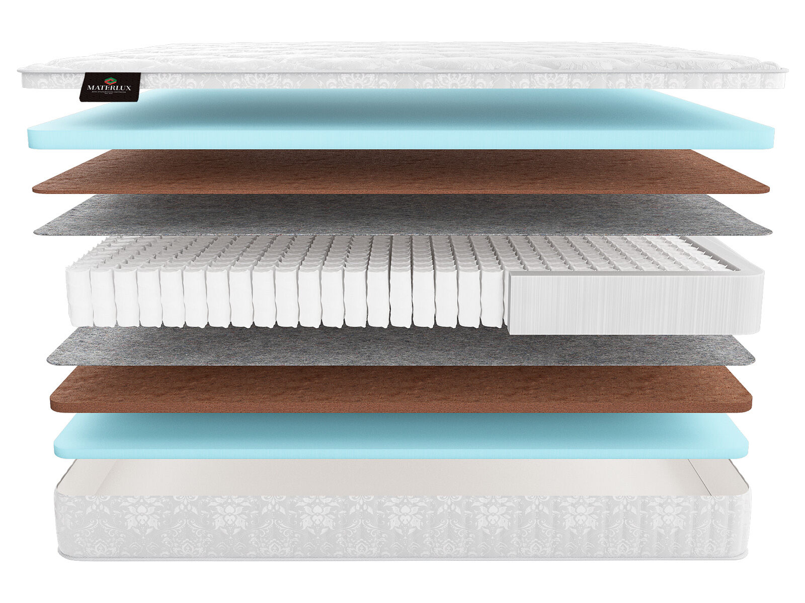 Латексированный кокос (пл 85; 1 и 3 см): обеспечивает прочность и долговечность матраса, предотвращая его проседание и деформацию. Он также обладает отличными ортопедическими* свойствами, обеспечивая правильную поддержку позвоночника.