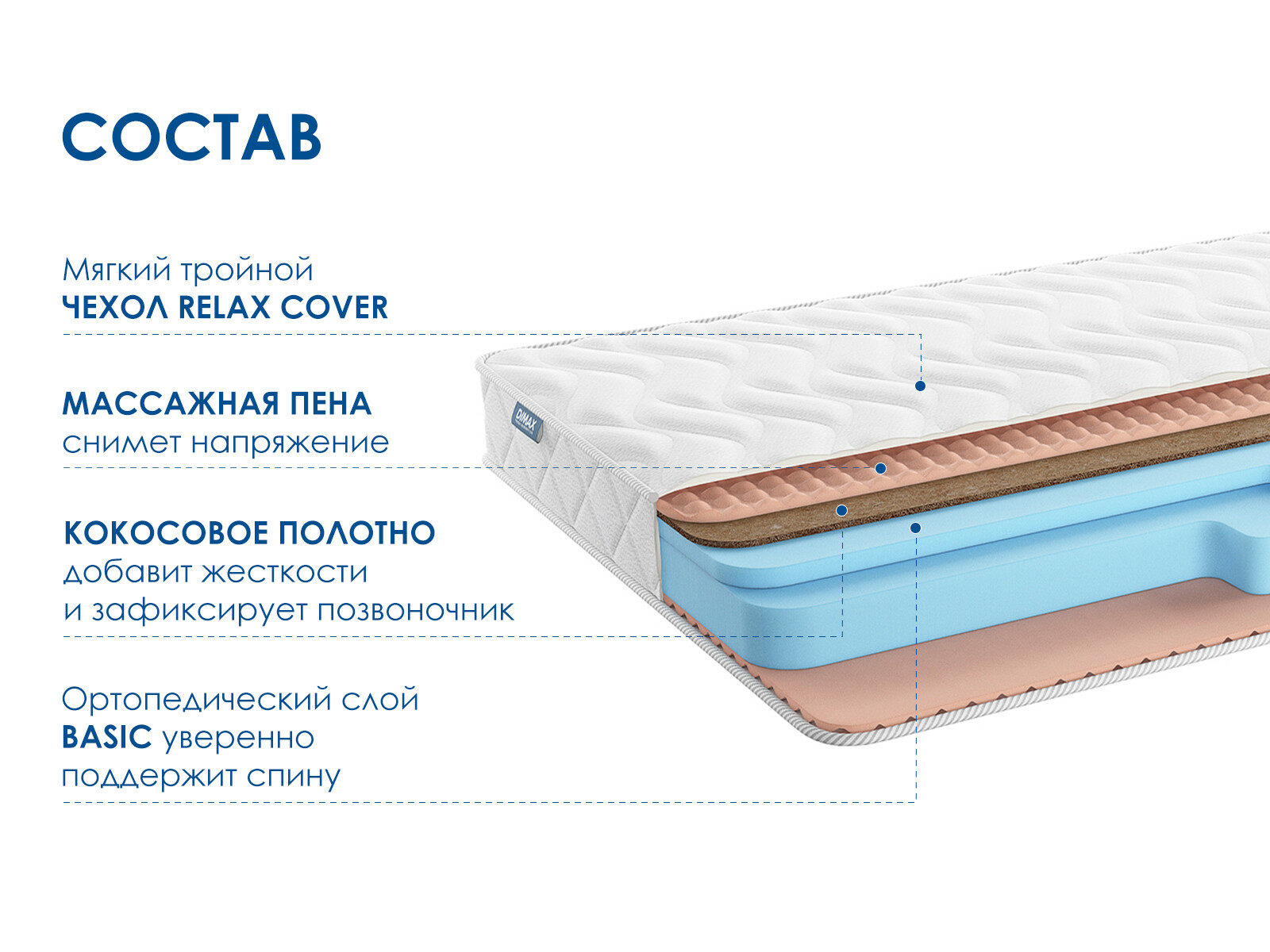 Беспружинный массажный матрас Димакс Relmas Cocos Roll 16 сочетает два уровня жёсткости: выше среднего и классическую среднюю. Разносторонняя конструкция позволяет выбрать поверхность под свои предпочтения, а массажный эффект дополнительно улучшает качество отдыха.