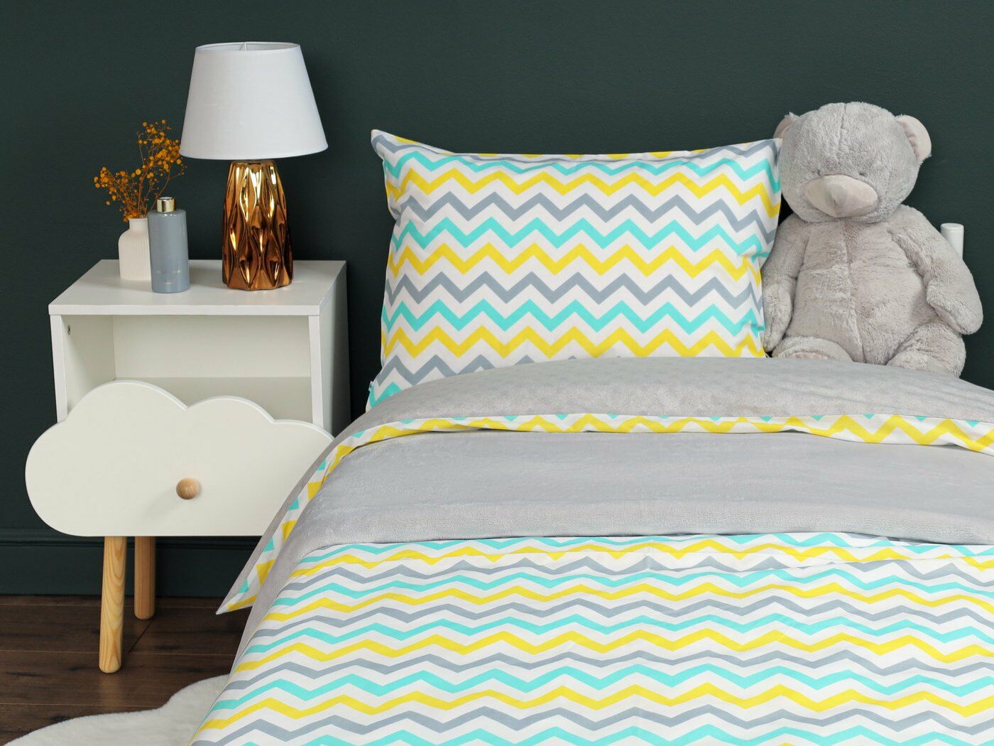 Пододеяльник –двусторонний: верх из ткани А (принтованная ткань), обратка из ткани В (однотонная рогожка), с потайной молнией.