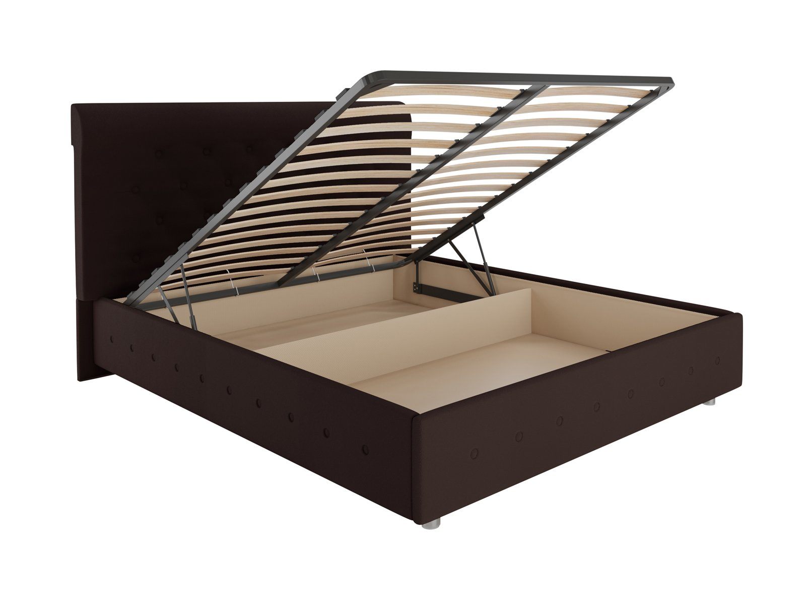 В комплект входит ортопедическое металлическое разборное основание с подъемным механизмом. При желании основание всегда можно поднять и получить доступ к вместительному бельевому ящику. Это дополнительная система для хранения постельных принадлежностей. Она позволит разгрузить шкаф и спрятать сезонные вещи.