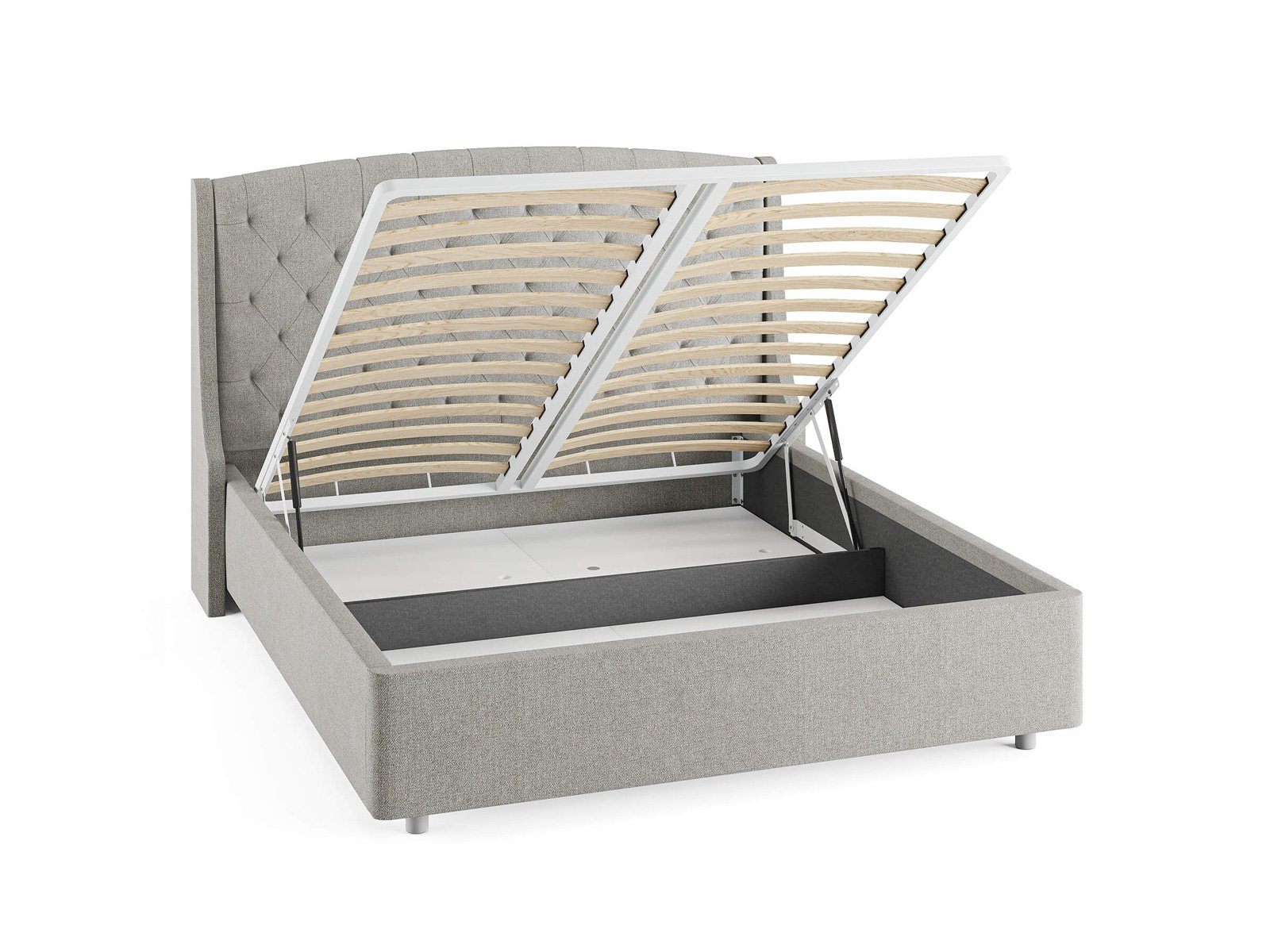 Кровать комплектуется металлическим основанием и подъемным механизмом со вместительным бельевым ящиком. Дно бельевого ящика легко сдвигается для обеспечения уборки под кроватью.