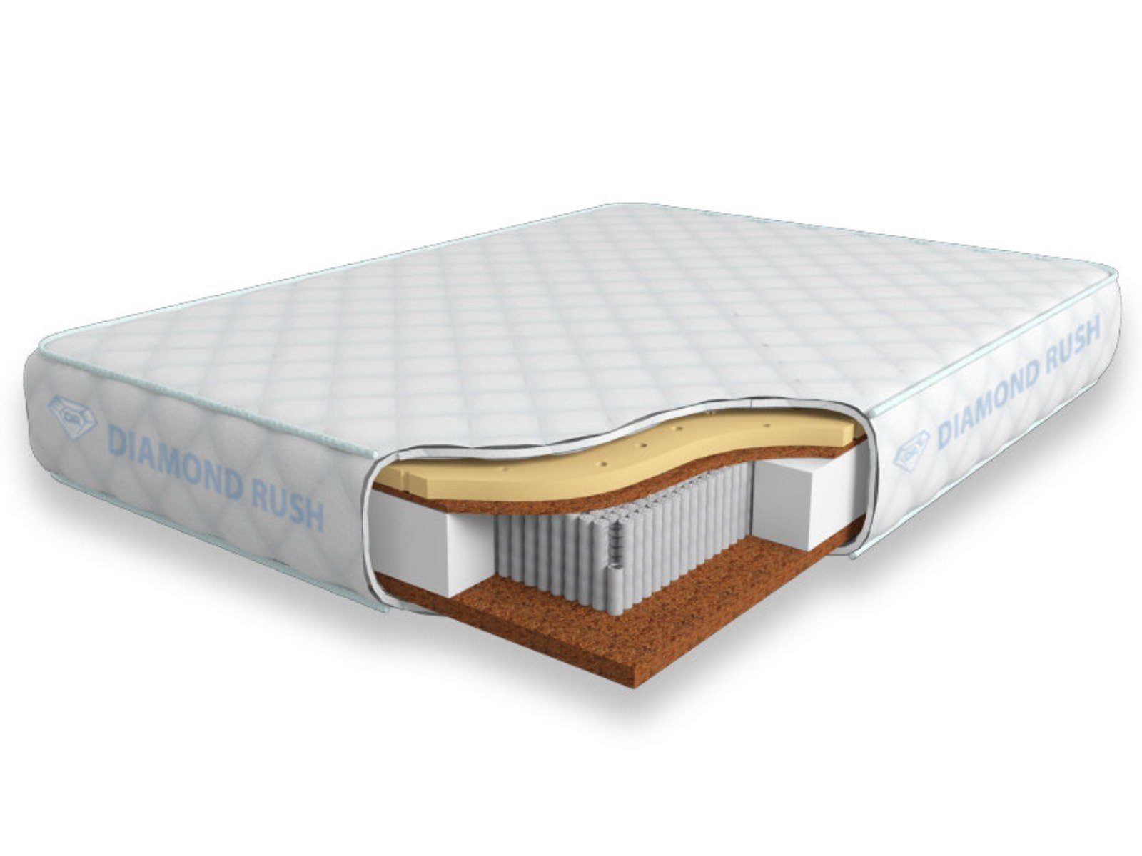 Данный матрас из серии Luxury Diamond имеет в своей основе независимый пружинный блок 3000, состоящий из пружин диаметром 2-3 см. В качестве настилочных слоев поверх пружинного блока используются листы латексированной кокосовой койры и перфорированного натурального латекса. Матрас является жестким с одной стороны и среднежестким с другой.