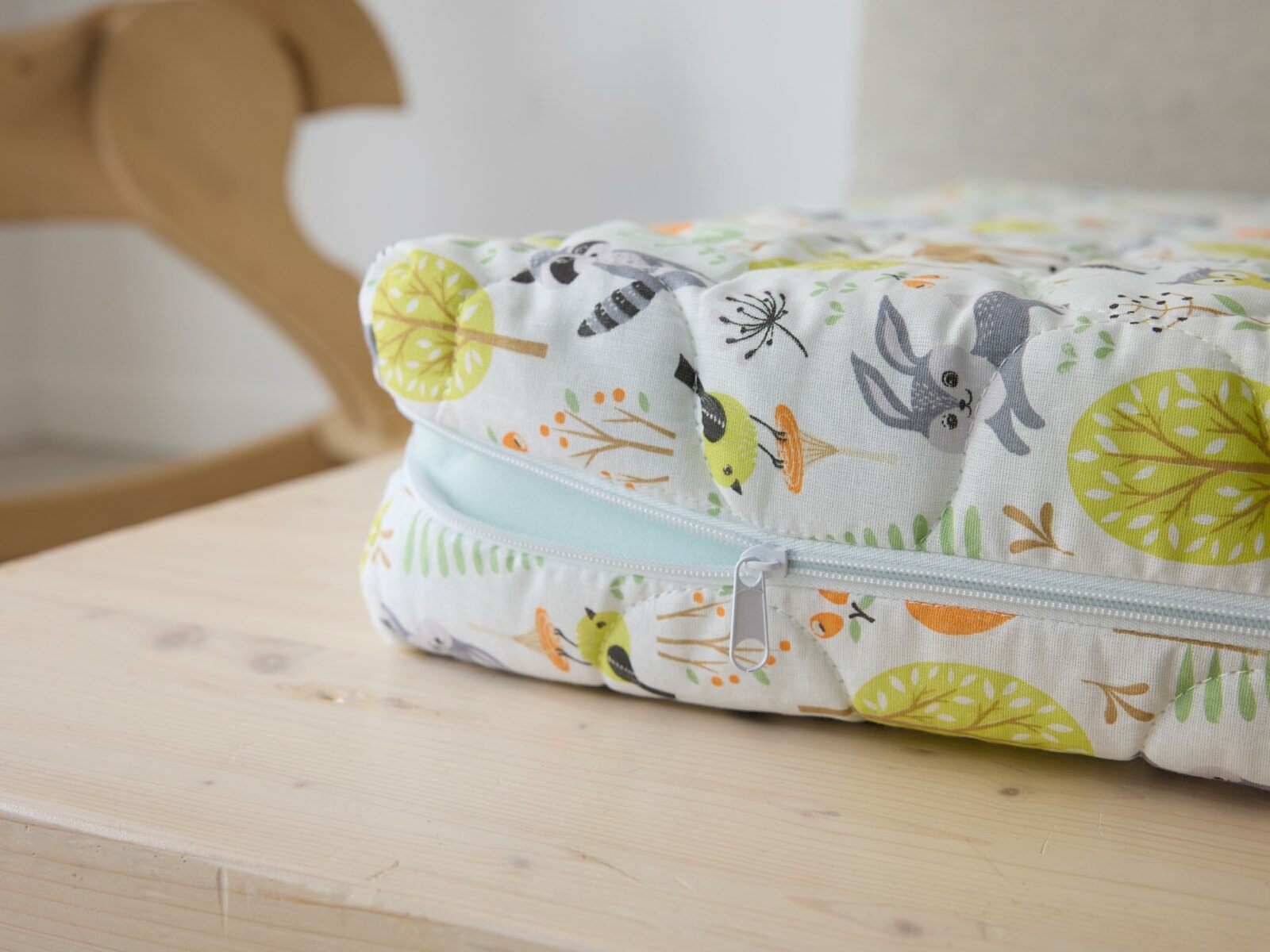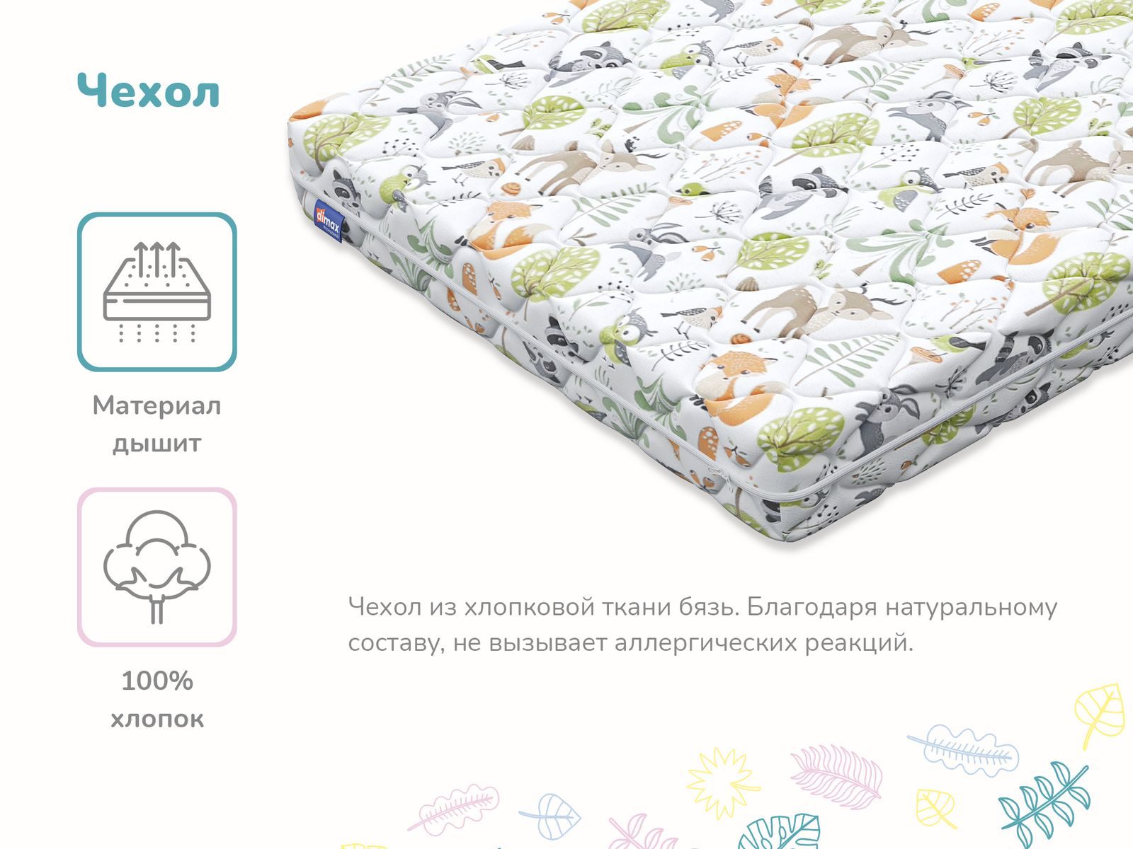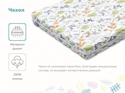 Матрас поставляется в красочном детском чехле из хлопковой бязи. Обивка имеет молнию, поэтому её удобно снимать для стирки и уходом за матрасом.