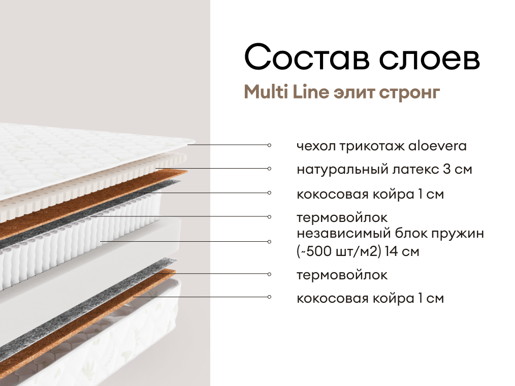 Матрас Мистер Слип Multi Line элит стронг — это модель с качественными натуральными наполнителями, включающая слой латекса, кокосовую койру и усиленный пружинный блок. Эти материалы обеспечивают надёжную ортопедическую поддержку и комфорт, оставаясь практичным выбором для тех, кто ценит долговечность и естественные материалы.
